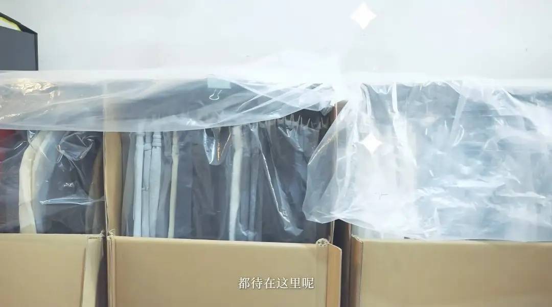 拉开防尘布以后,就是整整齐齐的大箱子。真的很难想象,原来明星家庭搬个家逛衣服都要塞满一套房。