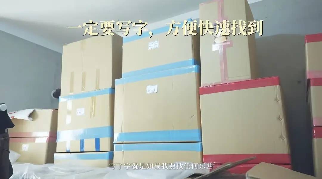 为了更快速的区分箱子里面的衣物,她还特意用不同颜色的胶带来密封。蓝色胶带的纸箱装老公衣物,粉色装女儿衣物,红色则是自己的衣物。